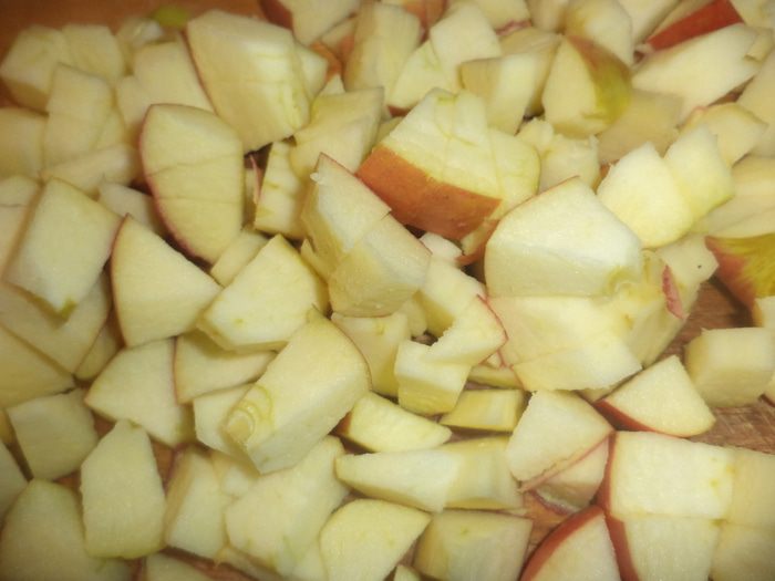 Репчатую луковицу нарезать полукольцами. Яблоко, удалив сердцевину, нарезать ломтиками и сбрызнуть лимонным соком.