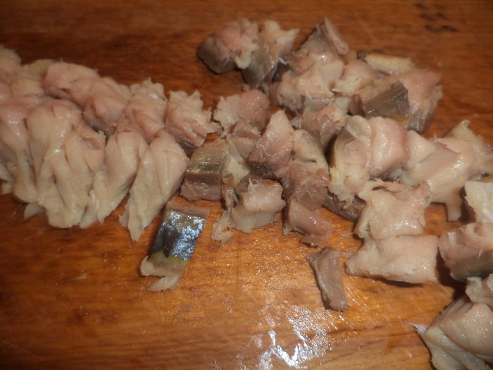 Филе скумбрии отделить от костей и нарезать маленькими кусочками.