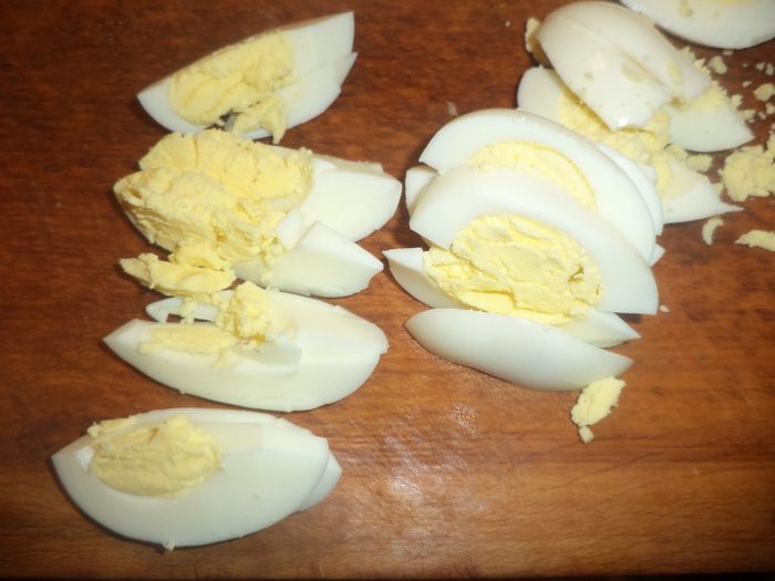 Яйца сварить вкрутую, остудить, очистить и нарезать ломтиками.