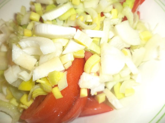 Помидор и белую часть лука-порея нарезать ломтиками и сбрызнуть уксусом. Маринованные огурцы нарезать кубиками. Небольшой пучок зелени порубить.