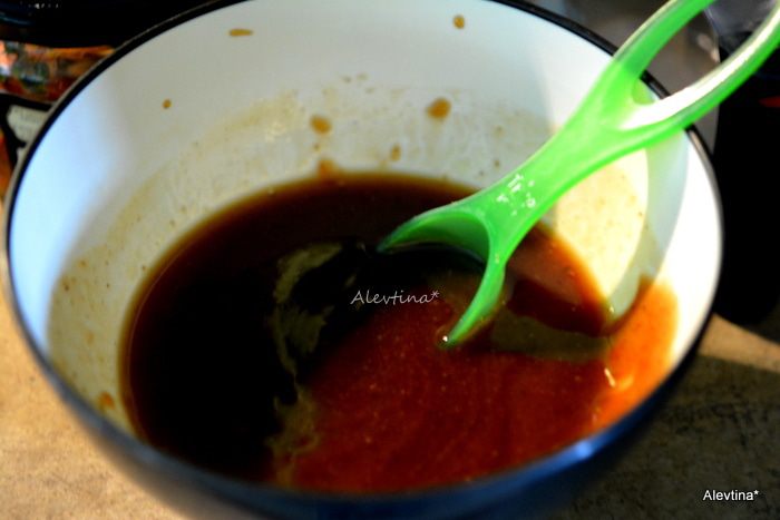 Смешать кетчуп, соус барбекю, сахар коричневый, вода 1/4 стакана.