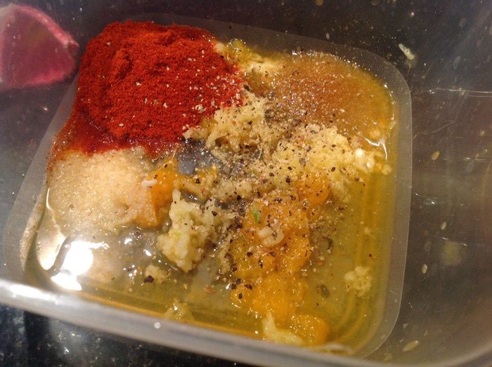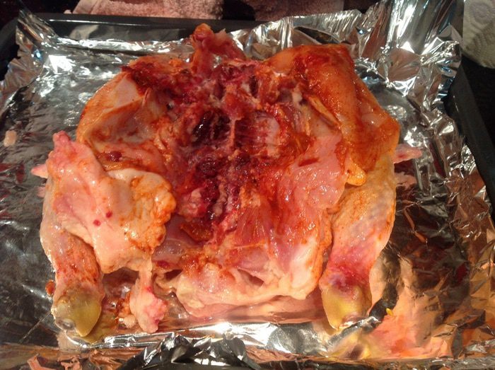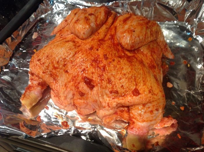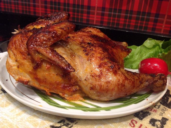 С этой стороны тоже хорошо натрите, выложите на противень и готовьте в духовке 1 час 20 минут, регулярно поливая курочку, выделившимся соком. Возможно, понадобится немного дольше времени, зависит от размеров курицы, у меня была 1,4 кг. Готовность проверьте, проколов курицу вилкой, сок должен быть прозрачный, без крови.