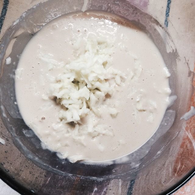 В это время натираем на терке половинку яблока без кожуры, добавляем в тесто и снова перемешиваем.