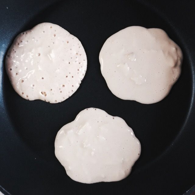 Поджариваем панкейки на среднем огне на антипригарной сковороде. Как только на всей поверхности появились пузырики, переворачиваем.