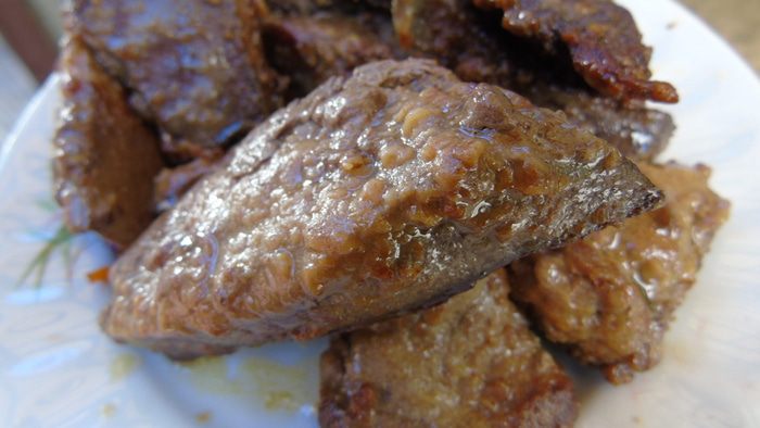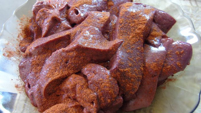 Пока тесто подходит займемся начинкой. Печень нарезаем ломтиками, присыпаем паприкой.