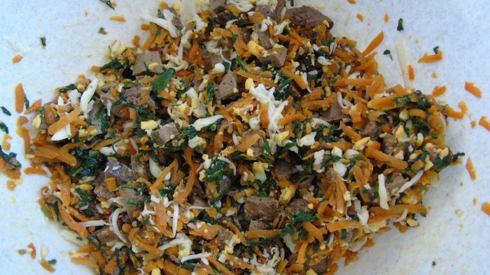 Яйца отвариваем, печень нарезаем кубиками, смешиваем с морковью, шпинатом и нарезанными яйцами. Солим, перчим.