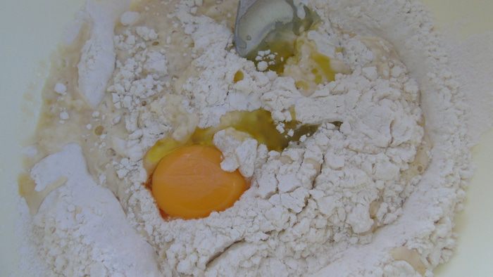 Добавляем жидкие ингредиенты в муку.