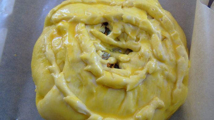 Смазываем яйцом и присыпаем кунжутом, украшаем при желании и включаем духовку на 190С . Пока духовка разогревается, накрываем пирог полотенцем и даем немного подойти.
