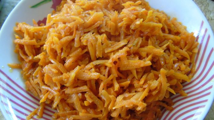 Морковь отвариваем и натираем на крупной терке или же натираем и обжариваем до мягкости.