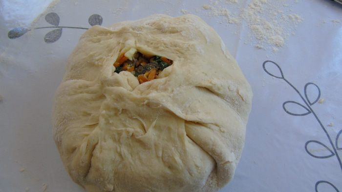 Выкладываем горкой начинку на середину и заворачиваем края теста обтягивая начинку, в центре оставляем отверстие для выхода пара.