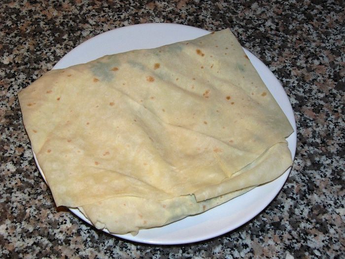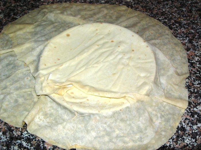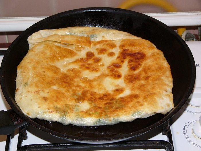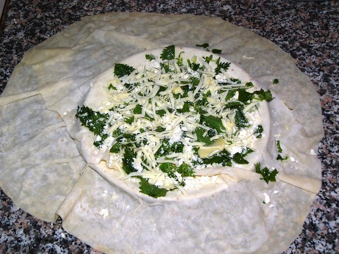 На центр (т.е. на тарелку) выкладываем любую начинку. Варианты тут могут быть разные: отварной картофель+зелень+сыр, фарш+лук, кабачок+брынза+сыр; шпинат+брынза+сыр; ветчина+сыр или то, что у вас завалялось в холодильнике. Единственное скажу, что сыр добавлять почти всегда кстати, потому что при жарке он так вкусно плавится и растекается внутри, что устоять невозможно. Очень вкусно, кстати, просто лепешка с сыром. Часто есть в меню турецких кафе.