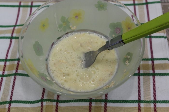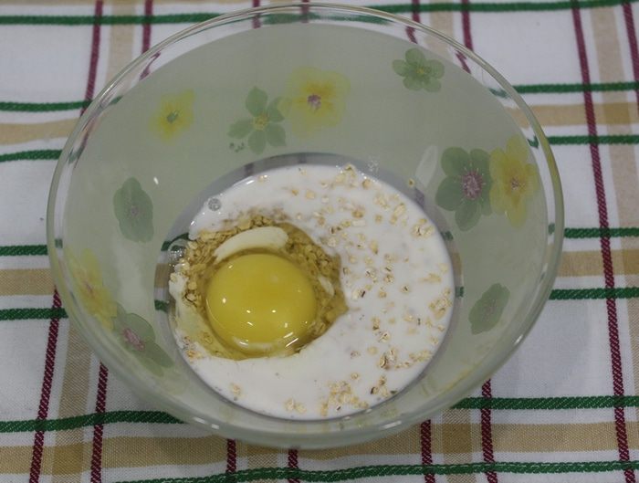 Яйцо, хлопья, молоко и соль кладем в миску.