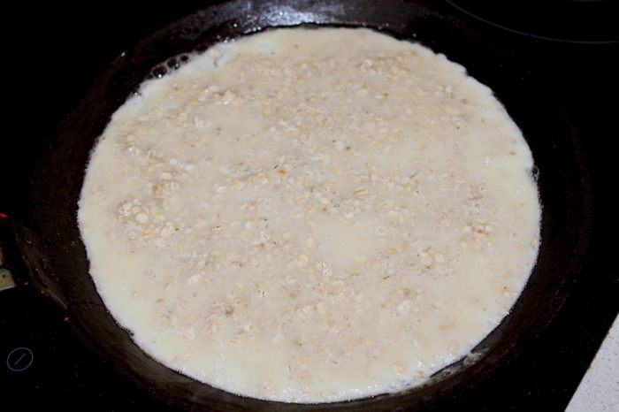 И выливаем на раскаленную смазанную сковороду, блин должен схватиться с одной стороны..