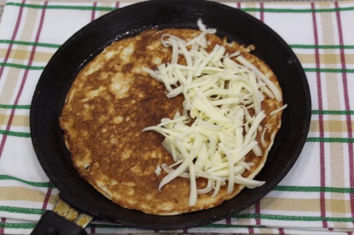 Переворачиваем блин, кладем на него любую начинку (у меня сыр), можно положить помидорки, зелень, колбаску, творог с зеленью и т.д.