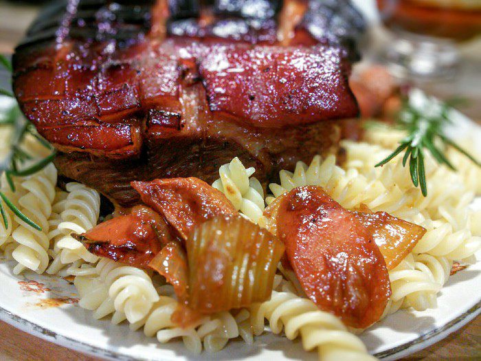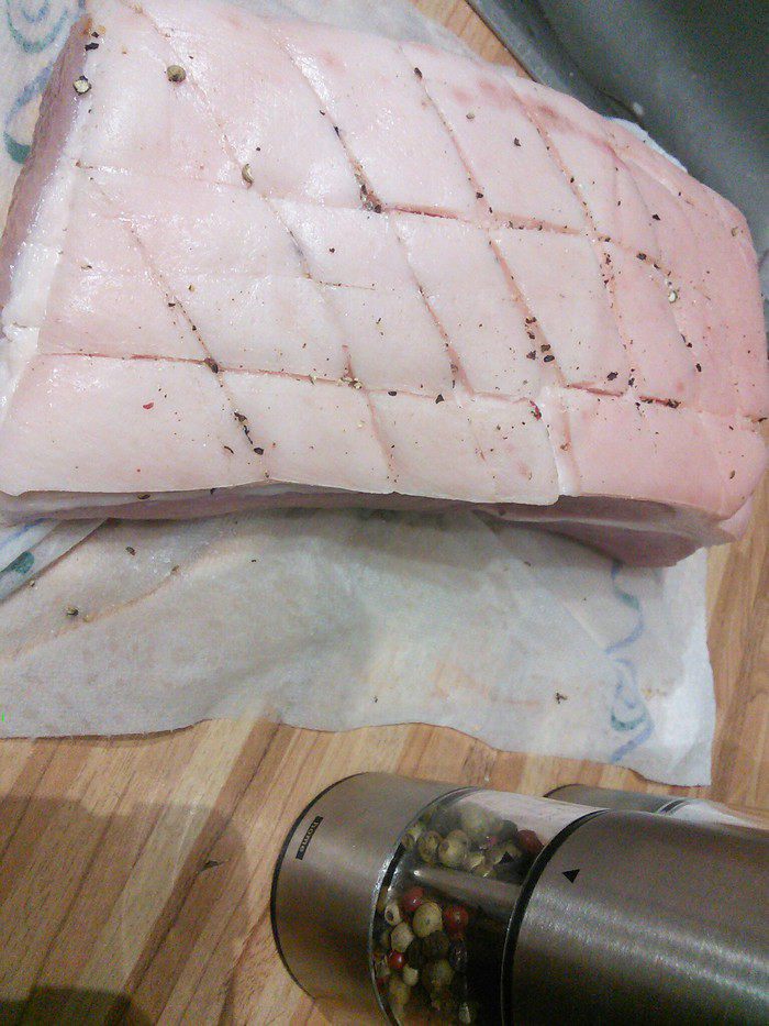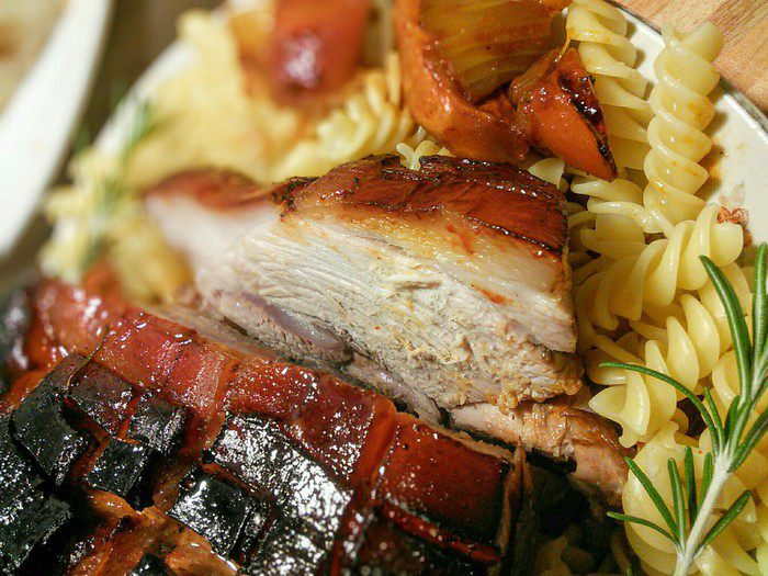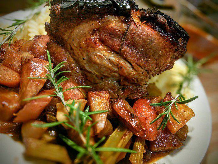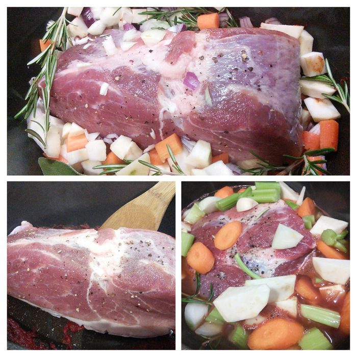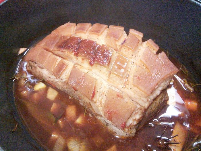 Мясо поместить в емкость кожицей вниз, влить вино и бульон, выложить вокруг порезанные на кубики овощи, розмарин и чеснок. Запекать 30 мин на втором снизу ярусе духовки. Теперь температуру в духовке снизить до 180°С (это важно, иначе корочка обгорит).