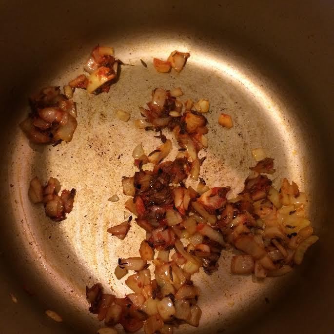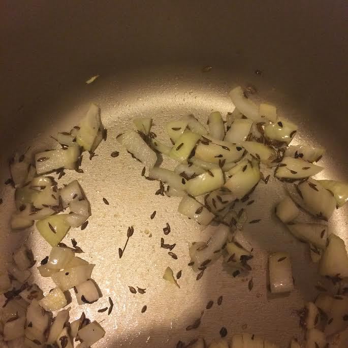 Кастрюлю разогреть, насыпать чили и кумин. Подождать, пока специи пустят аромат (1 минута), и начнут прыгать.