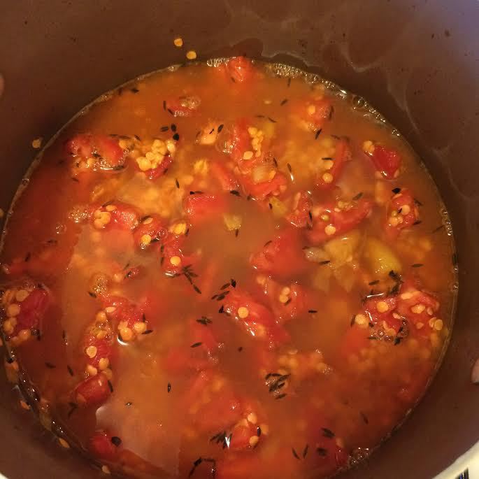 Чечевицу лучше брать красную, дробленую. Помидоры очистить и нарезать. Чечевицу хорошо промыть. Добавить к луку помидоры, чечевицу и бульон. Накрыть крышкой и варить 15 минут.