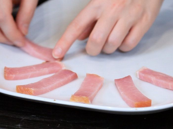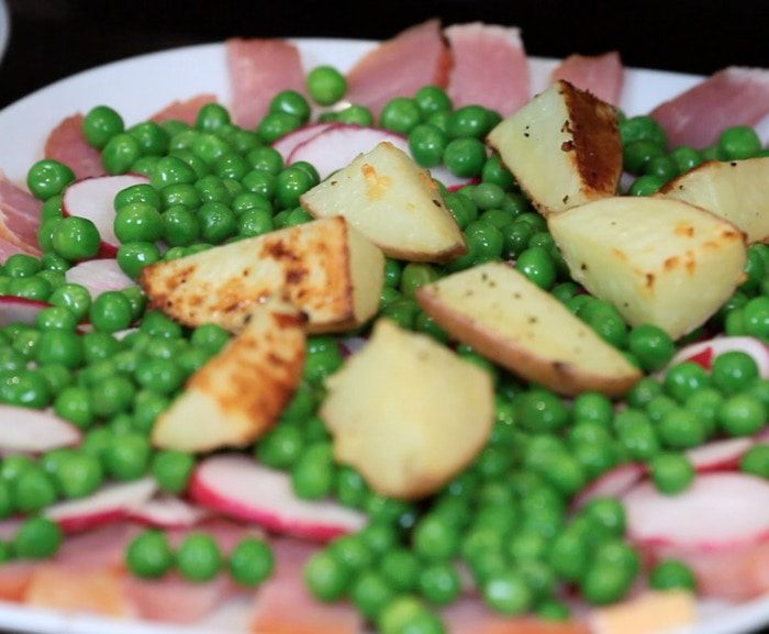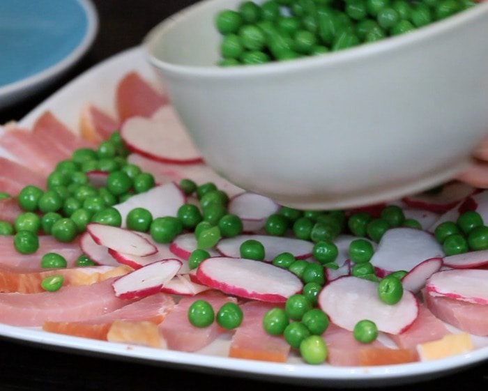 Если используете замороженный горошек, то бланшировать его в кипятке пару минут. Начинаем сервировку. Сначала выкладываем слой ветчины или карбонада. Я использовала карбонад.