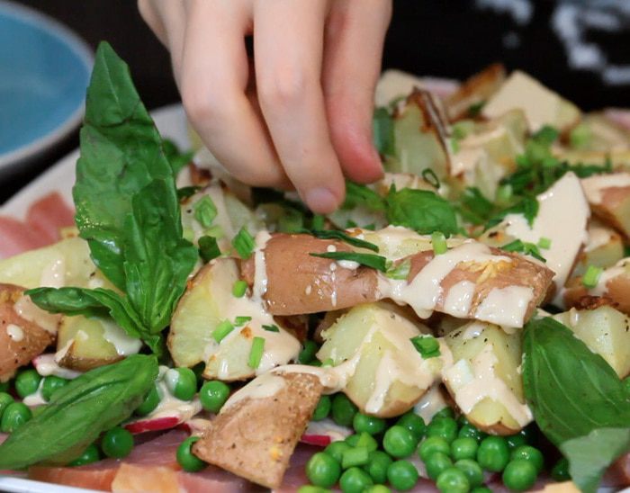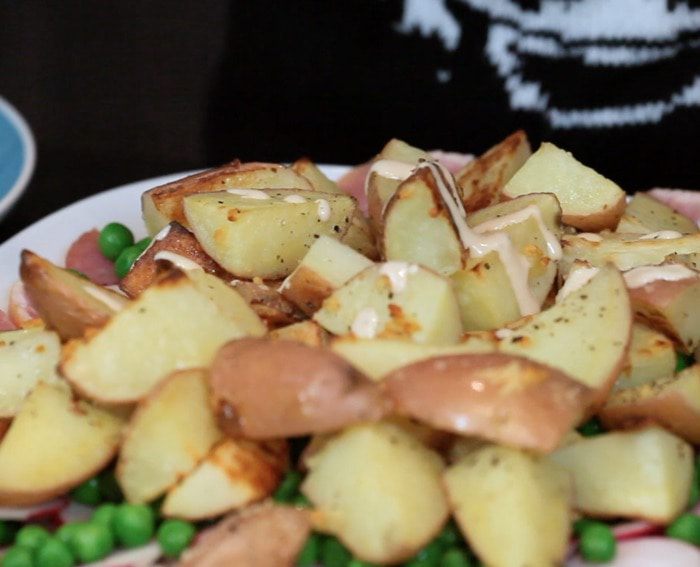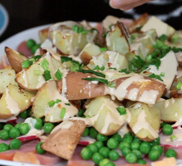 Поливаем небольшим количеством заправки. Советую не использовать её всё сразу, а подать к столу в отдельном соуснике, чтобы каждый добавил себе по вкусу.