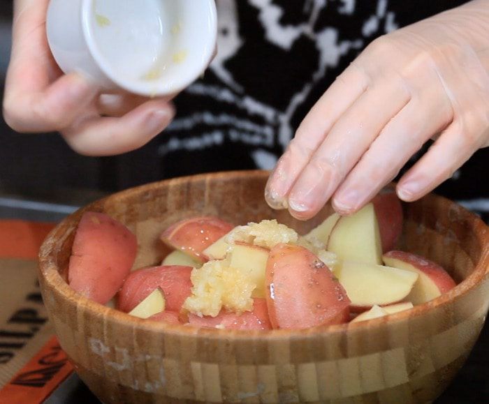 Разогреть духовку до 220°С. Нарезать картошку, если она большая или запекать целиком маленькую. Смешать чеснок, 1 ст. л. масла и картошку. Выложить на противень и запекать 15-20 минут.