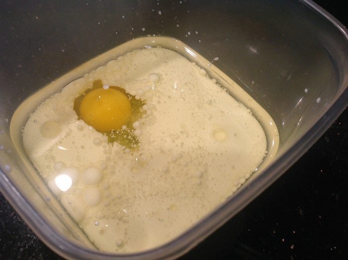 Отдельно смешайте молоко, сметану, яйцо и растительное масло.