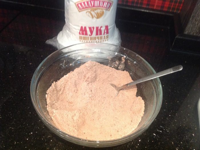 Просейте муку, смешайте с корицей, какао, разрыхлителем, содой, солью и сахаром.