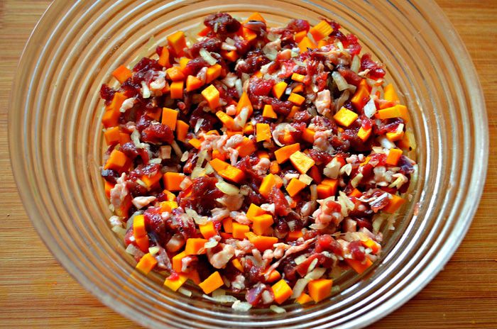 Подготовленные для начинки продукты смешайте, посолите, добавьте зиру и приправить перцем.