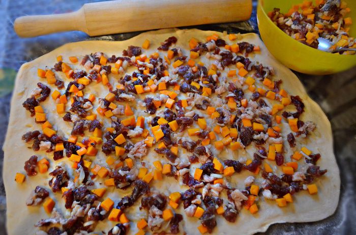 На раскатанное тесто выложите равномерно слой начинки.