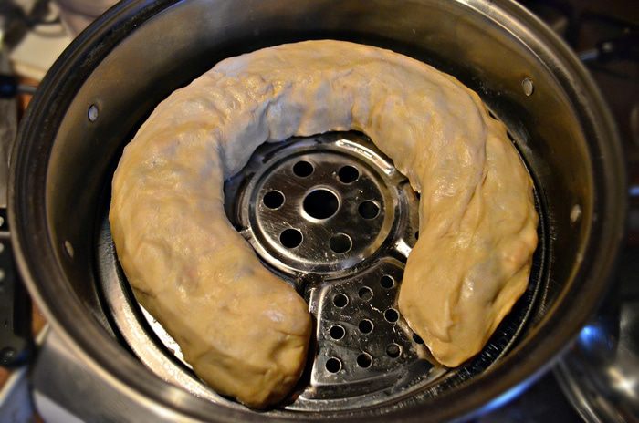 Один край пласта вместе с начинкой необходимо завернуть. Аккуратно заверните пласт с той же стороны ещё раз. Сверните, таким образом, пласт в не тугой рулет. Перенесите рулет в пароварку (донышко смажьте растительным маслом, чтобы тесто не прилипало). Готовьте ханум 50-60 минут.