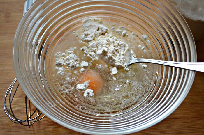 Для начало подготовим тесто. Для этого смешайте муку, яйцо, 2 ст. л. растительного масла и 2/3 ч. л. соли. Добавьте 0,5 стакана воды и замесите гладкое нежное тесто.