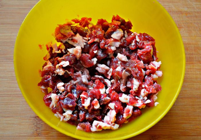 Для приготовления фарша я мелко порубила ножом жирную баранину. Если вы используете нежирный фарш, то для сочности желательно добавить небольшой кусочек рубленного сала.