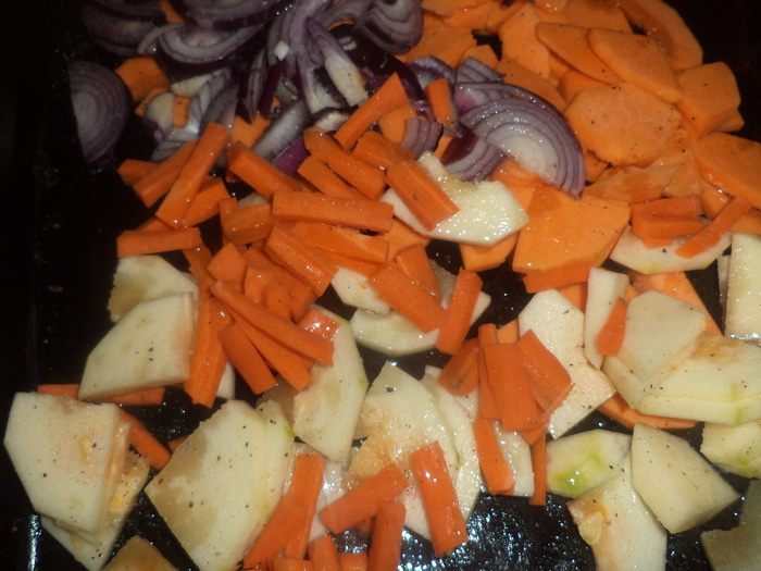 Противень смазать оливковым маслом, выложить овощи, сбрызнуть оливковым маслом, посолить, поперчить и запекать 20 минут при температуре 180°С.