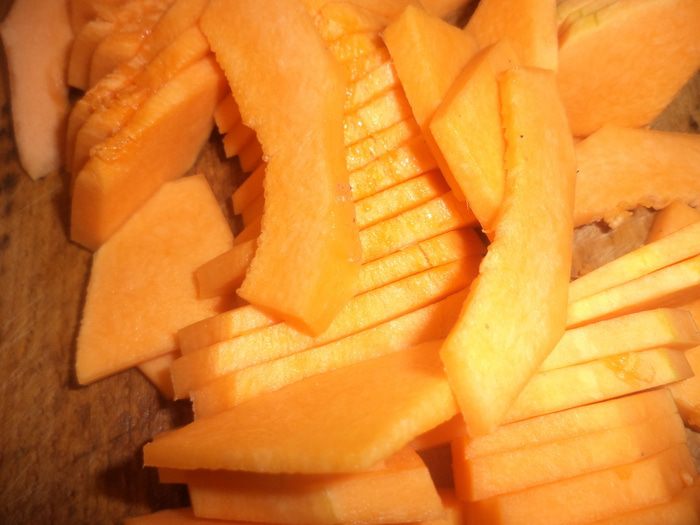 Тыкву очистить и нарезать ломтиками. Морковь очистить и нарезать толстой соломкой.