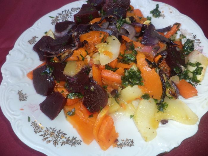 Свёклу очистить и нарезать ломтиками, перемешать с запеченными овощами. Салат посолить, поперчить, полить соусом, перемешать. Приятного аппетита!