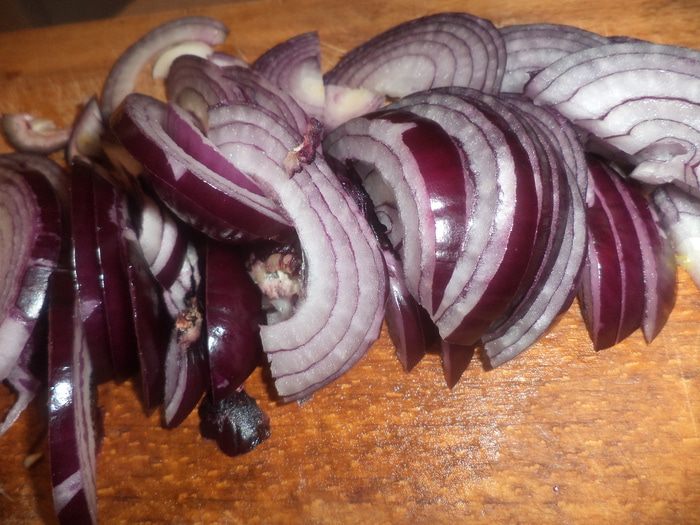 Лук очистить и нарезать полукольцами. Цукини нарезать полукольцами.