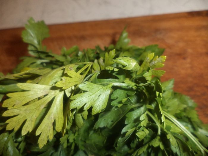 Для приготовления соуса выложить в чашу блендера зелень петрушки, чеснок и оставшееся оливковое масло, измельчить.