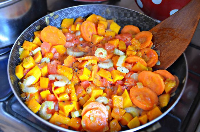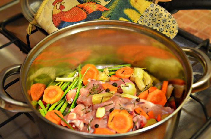 Для начала необходимо приготовить бульон. Куриная грудка у меня была с косточкой, поэтому основную мякоть я отделила. А из части мяса, что осталась на косточке, приготовила бульон. Добавьте в кастрюлю половину нарезанной кружочками моркови, вяленые помидоры, 1 стебель сельдерея, порезанный кусочками, стебли петрушки, перец горький и душистый горошком. Залейте 2 литрами воды. Готовьте бульон до готовности (около 40 минут), не забыв посолить по вкусу. За 5 минут до готовности положите в бульон лавровый лист.