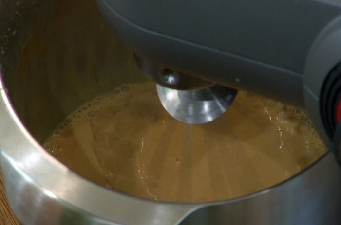 В чашу комбайна влить молоко, добавить 1 1/2 банки вареного сгущенного молока и взбить все насадкой-венчиком в густую карамельную массу.