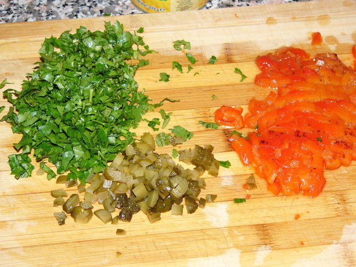 Красный перец запечь или взять запеченный маринованный. В данном случае пикантность нам только на руку. Нарезать перец, огурцы, зелень по возможности мелко.