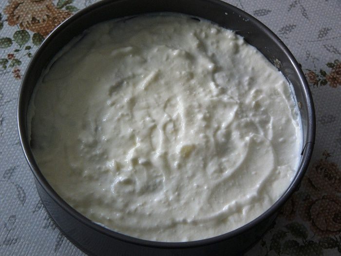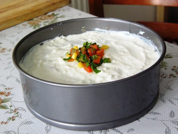 Далее формируем наш "торт". Понадобятся борта от небольшой круглой формы. На дно подставляем тарелку. Утрамбовываем пюре внутри формы. Сверху поливаем натуральным йогуртом. Количество указано примерно. Достаточно полностью покрыть пюре не очень толстым слоем.