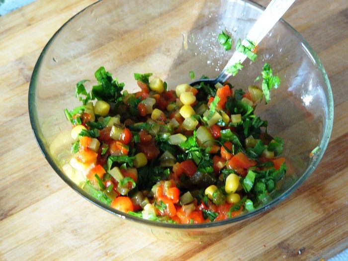 Смешать нарезанные овощи, зелень, кукурузу в отдельной миске, добавив немного оливкового масла.