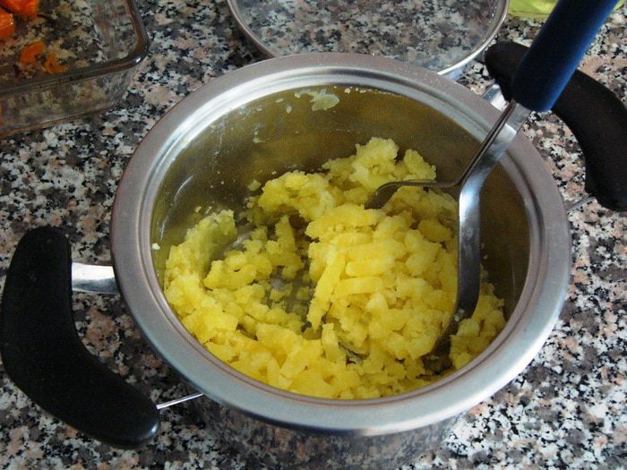 Отваренный картофель размять в пюре.