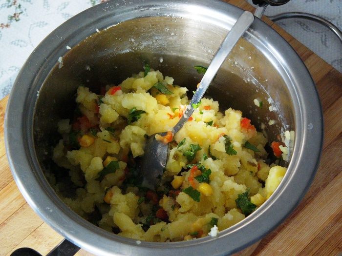 Половину овощной смеси добавить в картофельное пюре. По вкусу приправить лимонным соком (я использовала половину лимона), оливковым маслом, посолить.