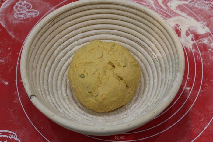 Выложить тесто в корзину, либо сформируйте шар, выложите его сразу на противень, смазанный маслом. Накройте пищевой пленкой. Поставьте в теплое место на 50-60 минут.