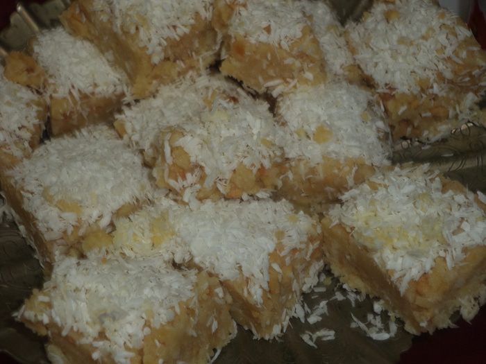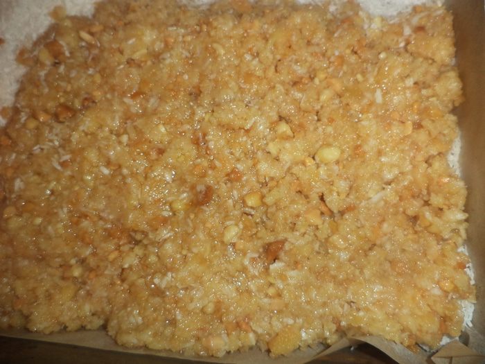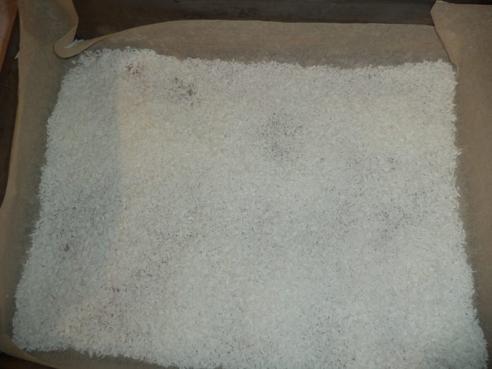 Квадратный противень выстелить бумагой для выпечки, посыпать 1/3 кокосовой стружки.