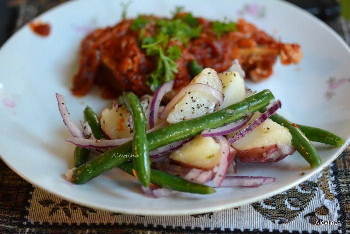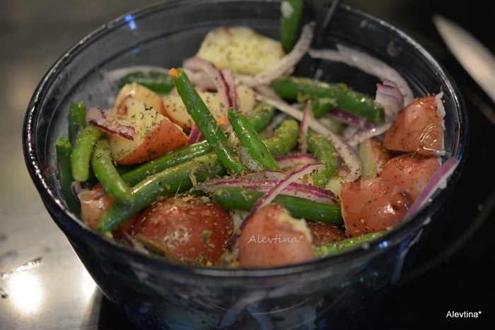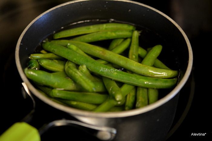 Отварить заранее красный картофель. Порезать кубиками. Отварить очищенную свежую фасоль в кипящей воде 4 минуты. Слить воду.