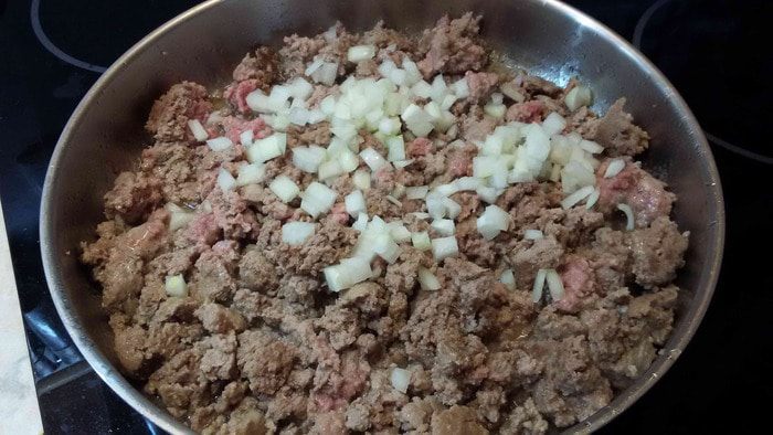 Фарш обжарить. Как только он посветлеет, добавить к нему мелко нарезанный лук.