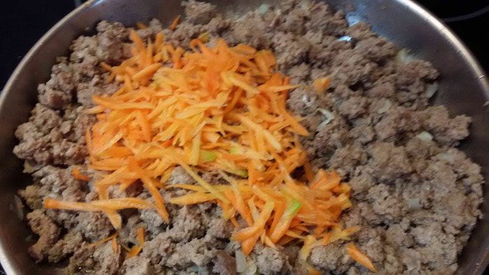 Морковь натереть на крупной терке. Добавить к фаршу. Жарить до готовности. Посолить и поперчить по вкусу.