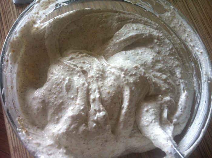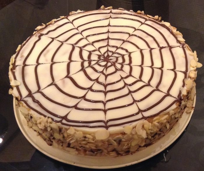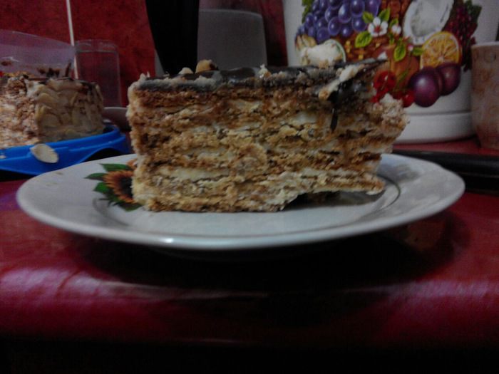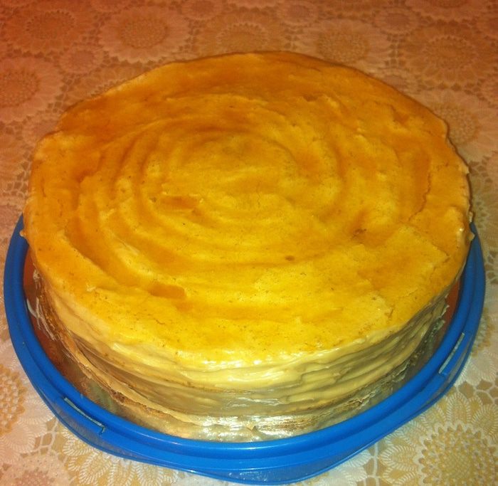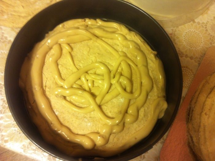 Я собирала в кольце 24 см, но оно было великовато. Лучше собирать в кольце нужного размера, но это необходимо, если Вы хотите получить абсолютно ровный торт. Для этого кладем корж, смазываем кремом, кладем второй корж. Пространство между боками и формой, заполнить кремом.