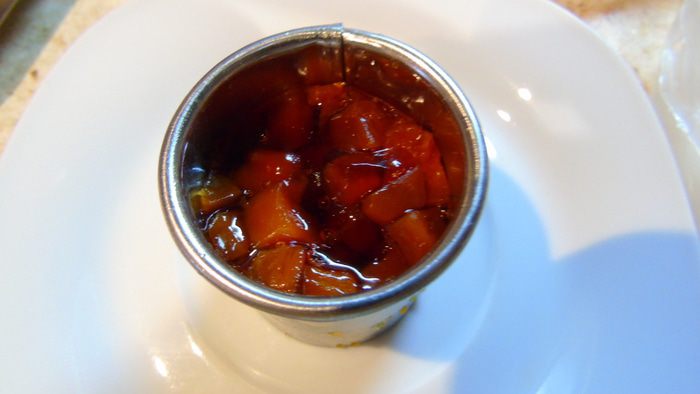 Снимите кольцо и пленку, сверху выложите кубики тыквы, украсьте мятой и чуть сбрызгните бальзамическим уксусом.
